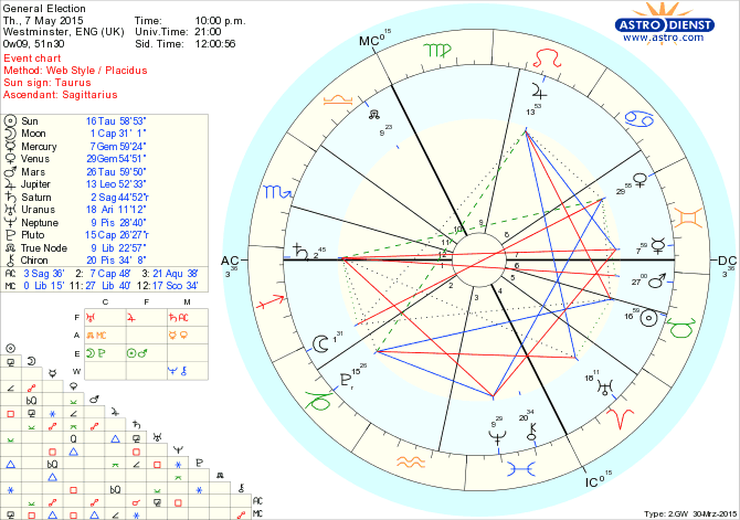 In drawing up a chart I have selected 10pm that evening (British Summer Time) as the “birth time,” as that will be the moment the polls close – and hence seal the fate of the election. For the place of birth I have used Westminster, i.e. the location of the Houses of Parliament. A chart drawn up using these data looks like this: