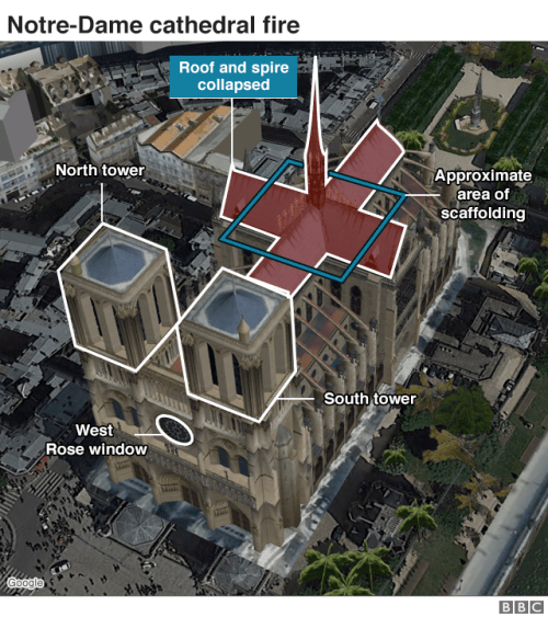 “The 850-year-old Gothic building’s spire and roof have collapsed but the main structure, including the two bell towers, has been saved, officials say.”