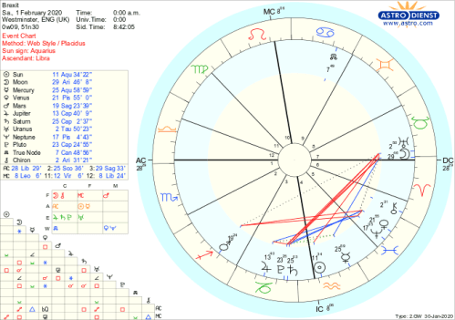 So here’s my dilemma. BREXIT officially happens at 0000 GMT on 1st February 2020. In trying to draw up a chart for it, and taking London as the “place of birth,” I notice that the Ascendant is in Libra, but right on the cusp of Scorpio. In other words, if BREXIT happened six minutes later, it would actually be in Scorpio.