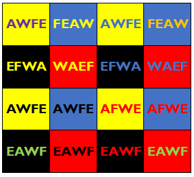 “Referring to the other squares of the lesser angles, in the Kerubic Rank the outside square is always attributed to the letter corresponding to Element of the Lesser Angle. In the Tablets of Air and Water, the Name read right to left in the upper two quarters; in the two lower quarters it reads from left to right. In the Tablets of Earth and Fire, left to right in the upper, but in the two lower quarters right to left.“