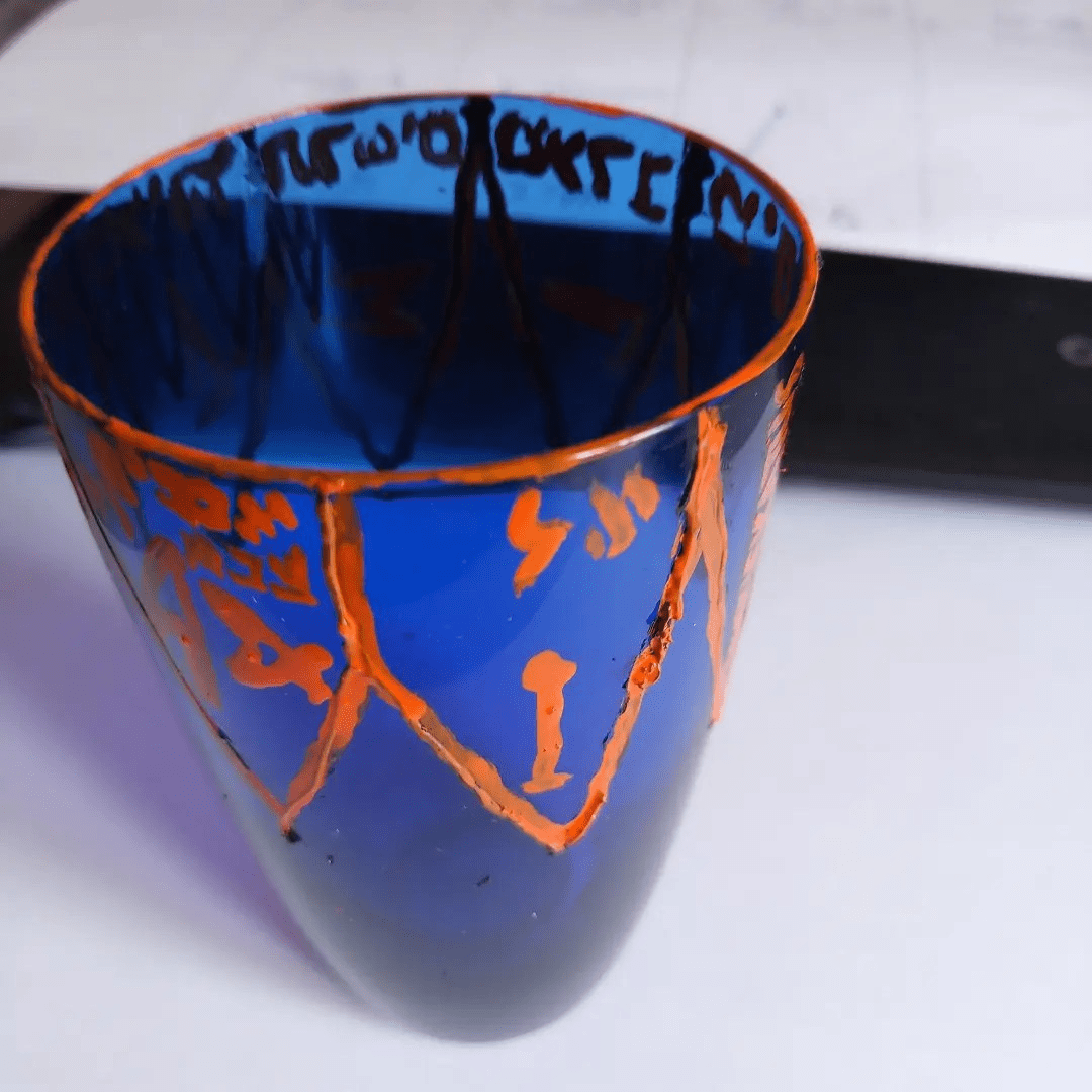 Once I had done that, painting the Cup itself was quite straightforward: I used a small tin of orange enamel paint, purchased from an art supply shop; and a tumbler made of blue glass which I had picked up from a charity shop. Total cost of materials approximately £5, and a couple hours of my time. I also printed out the consecration ceremony, making sure that I had figured out the correct pronunciation of the Enochian names involves, so I would not have to resort to guesswork or stumble over a bunch of eldritch consonants in the critical moment.