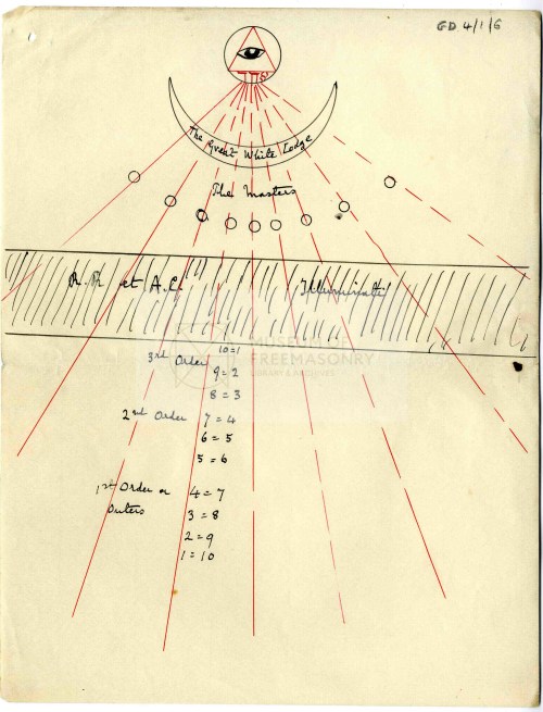 Quite apart from this document, which is in the archives of the Library & Museum of Freemasonry at Freemasons Hall in London, I have in my possession material from another source entirely which indicates that Amoun Temple worked all the Adept grades: Adeptus Minor 5=6; Adeptus Major 6=5; Adeptus Exemptus 7=4; as well as the Transmission of the Etheric Link. I presume that they must have done so using this arrangement: working them in a temporarily-installed Vault whilst they had it available. (I have seen no evidence that they worked the 8=3 and 9=2 grades, but that might be just be a shortcoming of the source of my data.)