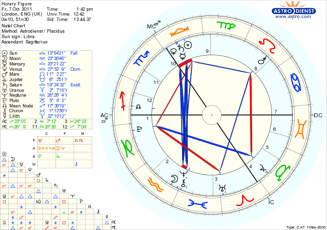 Yet it is the knowledge of the astrological situation on April 29th which conversely provides the key to a way out for the happy couple from their troubles. The essence of the Hermetic tradition is that by raising ones consciousness to a sufficient degree one can transcend the crossed-conditions of Fate, for which the planets of astrology are their outward symbols. The methods of overcoming the planets are nothing less than the rituals of e.g. the Hermetic Order of the Golden Dawn. Hence: we know that Saturn is badly placed on April 29th, thus one way to overcome this would be to cast the Supreme Banishing Hexagram of Saturn ritual, in order to counter-act that planet’s effects.