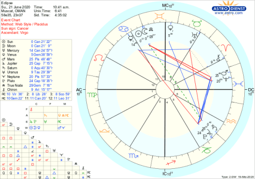 On a different tack, what I would say that the day of June 21st, 2020, is not a good day for making decisions, scheduling important events, or suggesting what you think are bright ideas. This is due to the fact of the Moon being said to be “Combust” i.e. in close conjunction with the Sun. The fact that it is also conjunct Caput draconis and square Mars only compounds the fact. Fortunately there is a simple method of avoiding the effects of a Combust Moon, which is to just wait 24 hours. In other words, June 21st 2020 will be a good day to avoid doing anything decisive and have the day off instead.