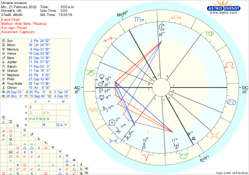 MI6 – CIA – stand aside! Read the only military Intel you will ever need right here, provided by your humble blogmaster. Today, I turn my astrological eye on the activities happening in the Ukraine, by analysing a chart drawn up for the moment Russian troops crossed the border into Ukrainian territory earlier this week.